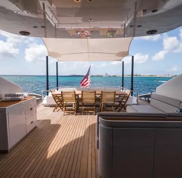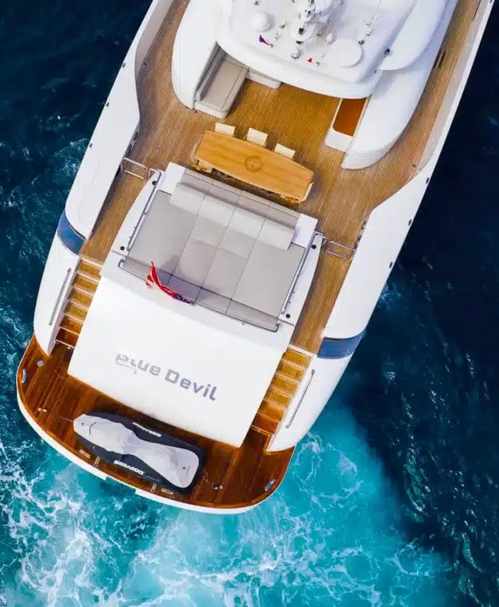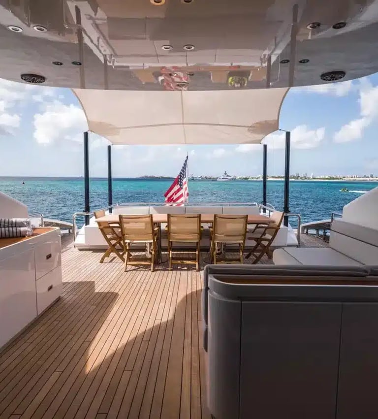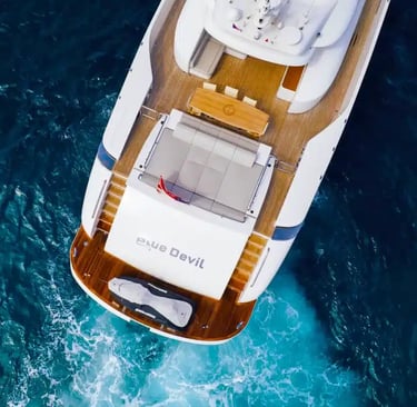 The expansive flybridge is an exceptional relaxation space, featuring areas for dining, sunbathing, or enjoying the breeze in the shade. An extended swim platform provides easy access to the sea for water activities, while modern amenities such as air conditioning and Starlink technology ensure ultimate comfort onboard.