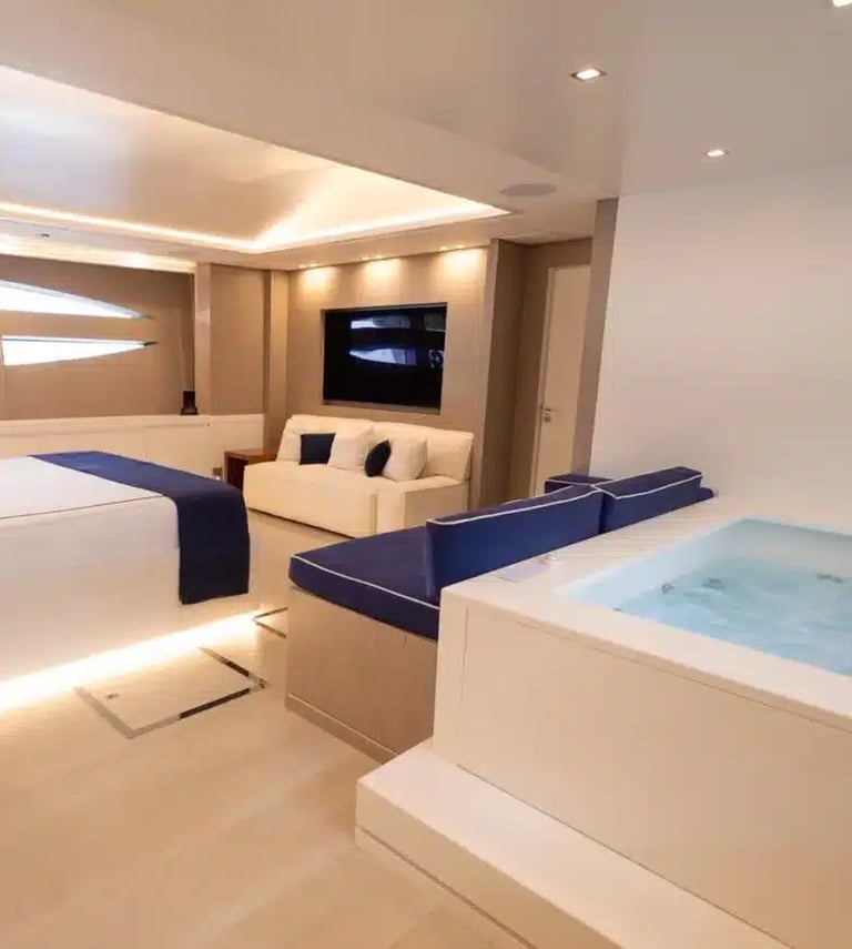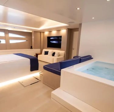 The AB 140 comfortably accommodates up to 10 guests in five beautifully appointed cabins, including a full-beam owner’s suite offering panoramic views and complete privacy. The full-beam VIP cabin features a king-size bed, while the three additional guest cabins are designed to provide both comfort and space, each with luxurious en-suite bathrooms.