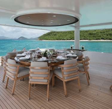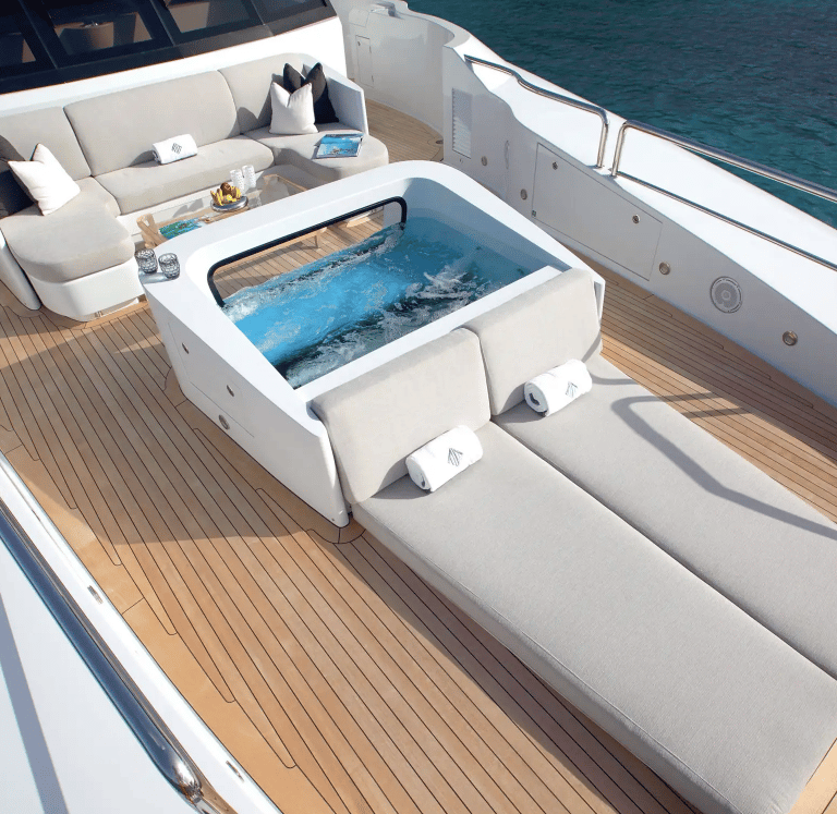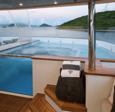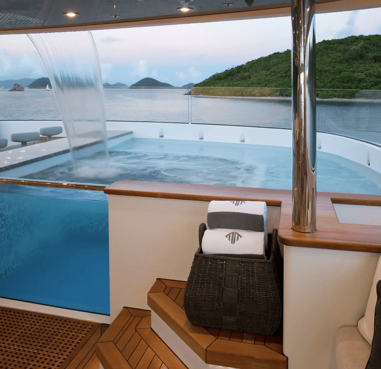 All-encompassing deck spaces include a jacuzzi with waterfall and sit up bar with BBQ on the sun deck, al fresco dining on the bridge deck and multiple lounge options