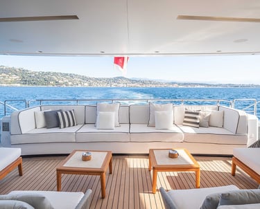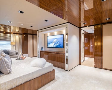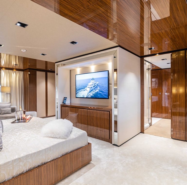 L’intérieur lumineux et élégant du Baglietto 150 est un parfait mélange de bois nobles, de finitions en laque brillante et de matériaux haut de gamme, tels que le marbre, le cuir fin et des tissus luxueux. La décoration contemporaine est rehaussée par des touches d'art italien, créant une atmosphère à la fois sophistiquée et chaleureuse. L’espace de vie principal est spacieux et ouvert, avec un salon doté de canapés confortables, une salle à manger formelle pour 12 convives et de larges fenêtres offrant une vue imprenable sur l’océan.
