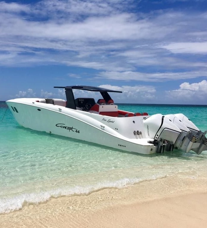 Bienvenue à bord de notre racé CONCEPT 44, un bateau doté d'une carène incroyable à St Barth.