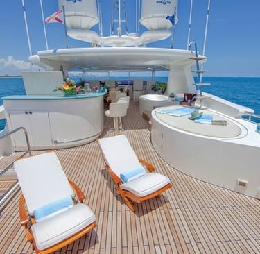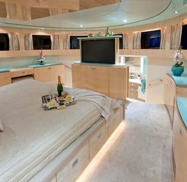 The bright and welcoming interior boasts high-gloss sycamore woodwork throughout along with stunning fabric and Lalique crystal panels, as well as generous use of teak, marble, granite, onyx, bone, mother of pearl, silk, and fine leather. The 105ft Johnson open flowing layout ensures guests never feel cramped and nowhere is this more true than the vast flybridge. Whether dining, entertaining, relaxing in the sun, or enjoying a cool breeze in the shade this deck has it all...including a Jacuzzi.