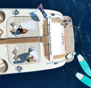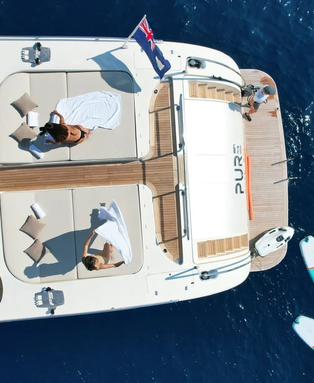 Outdoor Cockpit: A large cockpit equipped with sun loungers, a bar, and a dining area—perfect for soaking up the sun and enjoying the sea breeze.