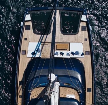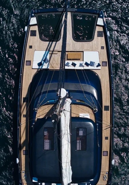 The foredeck offers a comfortable lounge area, sheltered from the wind and sun. The cockpit is equipped with a hydraulic platform for even more comfort.