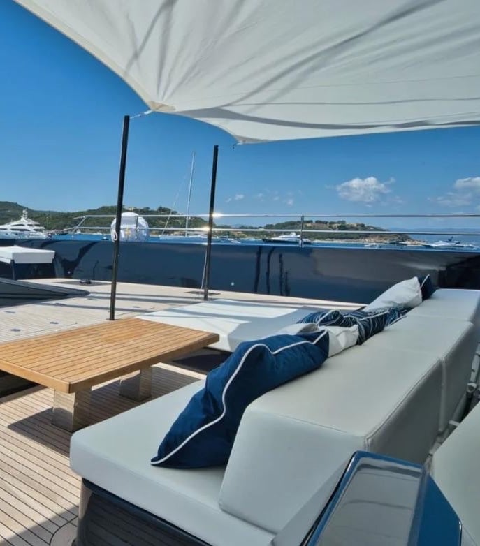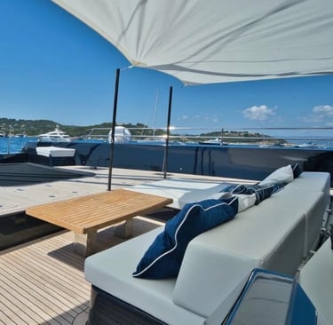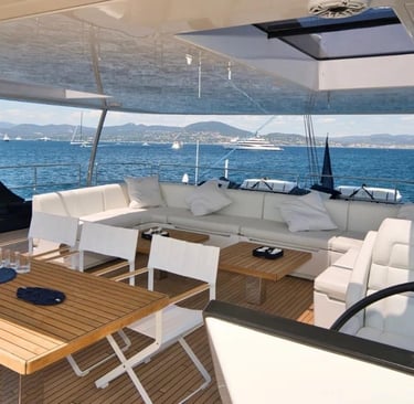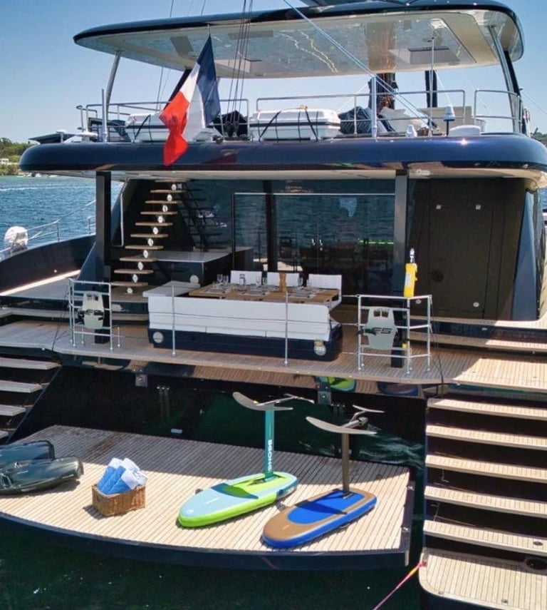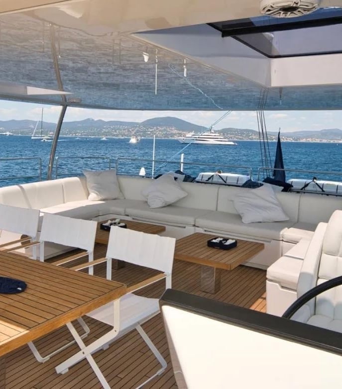 The 54m² upper deck is dedicated to the art of living at sea. There is a large dining table, movable furniture, a Jacuzzi, a bar with barbecue and sunbeds.